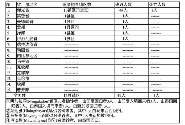 确诊者49人来自6个省邦地区的15个县区,其中由国外回归或进入者13人(由印度回归者3人,由泰国回归者3人,由新加坡回归者2人,由马来西亚回归者1人,由印度入境而来者3人,由泰国入境而来者1人),国内确诊人员36人。这国内确诊人员中,除明加拉洞镇区达到23人外,其余各县区确诊人数大都只是1人而已,但分布的地区却十分广泛,不能不令人格外注意与担心。
