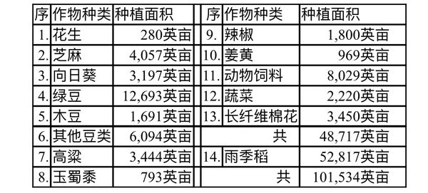 所规划种植的雨季作物包括,雨季稻52,817英亩,花生280英亩,芝麻4,057英亩,向日葵3,197英亩,绿豆12,693英亩,木豆1,691英亩,其他豆类6,094英亩,高粱3,444英亩,玉蜀黍793英亩,辣椒1,800英亩,姜黄969英亩,蔬菜2,220英亩家畜饲料8,029英亩,长纤维棉花3,450英亩。除雨季稻之外,其他雨季作物种植面积达到48,717英亩。如果连雨季稻种植面积52,817英亩也计算进去之话,全部雨季作物种植面积就达到101,534英亩了。