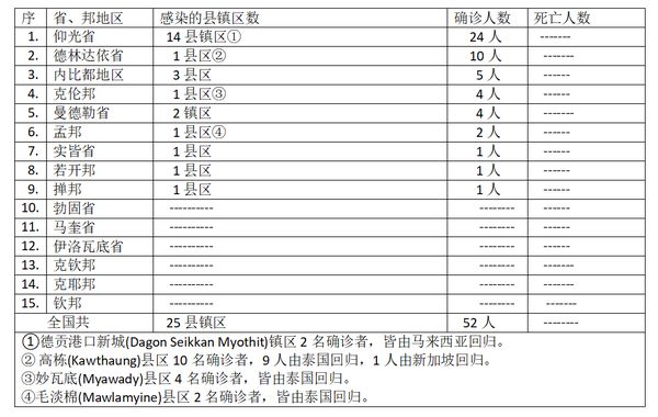 缅甸卫生部于8月24日下午4时发布公告,全国各省邦,8月23日的确诊人数52人,无死亡人数,具体数据如下表: