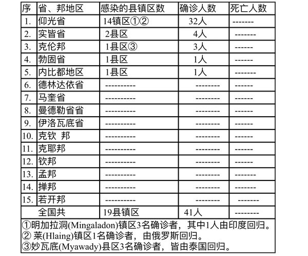 缅甸卫生部于8月28日下午4时发布公告,全国各省邦,8月27日的确诊人数41人,无死亡人数,具体数据如下表:
