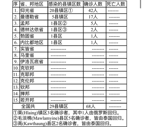 缅甸卫生部于8月30日下午4时发布公告,全国各省邦,8月29日的确诊人数68人,无死亡人数,具体数据如下表:
