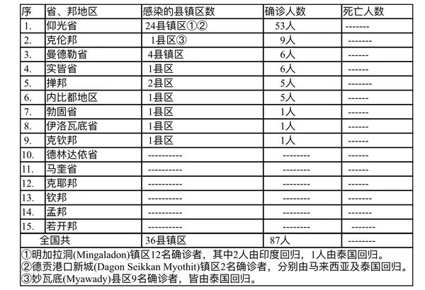 确诊者87人来自9个省邦地区的36个县镇区。这其中由国外回归者为14人(其中11人由泰国回归, 2人由印度回归,1人由马来西亚回归),国内确诊人员73人。这73名国内确诊人员中,仰光省就占了48人(接近三分之二的比例),可见仰光大都市疫情还真是不能掉以轻心。剩下的25名国内确诊者中,曼德勒省及实皆省各有6人;掸邦及内比都各有5人;勃固省、伊洛瓦底省及克钦邦各占1人。感染人员已遍布全国相当多的省邦地区,疫情蔓延情况确实不能大意了。