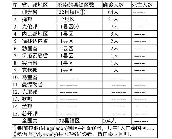 确诊者104人来自9个省邦地区的32个县镇区。这其中由国外回归者为8人(皆为由泰国回归者),国内确诊人员96人。这96名国内确诊人员中,仰光省就占了63人(接近三分之二的比例),可见仰光大都市疫情还真是不能掉以轻心。剩下的33名国内确诊者中,掸邦有21人,其中景栋县区就占20人,疫情情况不可小觑;内比都地区占5人,而且又是扎慕底律县区,最近几天该县区感染者已不在少数;勃固省及德林达依省区感染者分为2人;伊洛瓦底省实皆省及克钦邦确诊者各1人。感染人员已遍布全国相当多的省邦地区,疫情蔓延情况确实令人“惊心动魄”了。