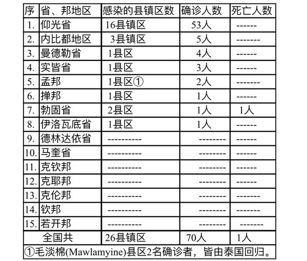 确诊者70人来自8个省邦地区的26个县镇区。这其中由国外回归者为2人(皆为由泰国回归者),国内确诊人员68人。这68名国内确诊人员中,仰光省就占了53人(占四分之三以上的比例),可见仰光大都市疫情还真不能令人放心。剩下15名国内确诊者中,内比都地区有5人,曼德勒省4人,实皆省3人,掸邦、 勃固省及伊洛瓦底省各1人。感染人员已遍布全国相当多的省邦地区,疫情蔓延情况确实是已达到令人“惊心动魄”的地步了。