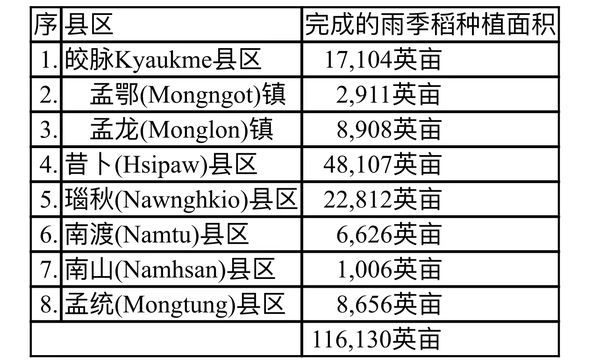 皎脉专区内的各县区所完成的雨季稻种植面积如下表:
