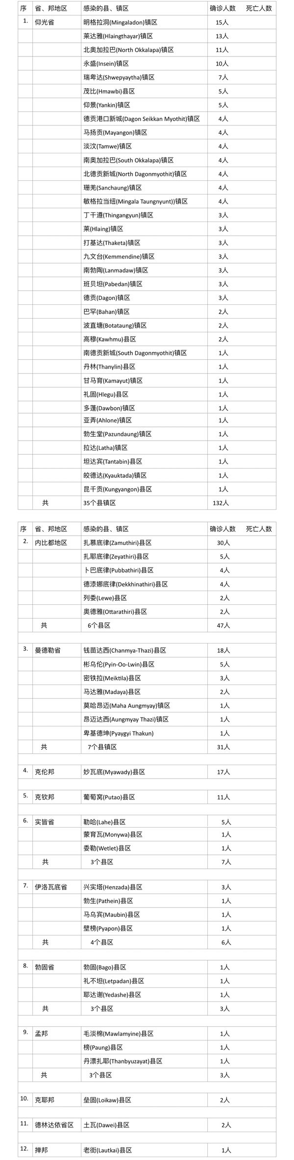 9月10日这一天缅甸全国确诊人数为262人,确诊人员来自仰光省、内比都地区、曼德勒省、克伦邦、克钦邦、实皆省、伊洛瓦底省、勃固省、孟邦、克耶邦、德林达依省及掸邦等12个省邦地区。各省邦地区感染的县镇区及确诊人数如下表: