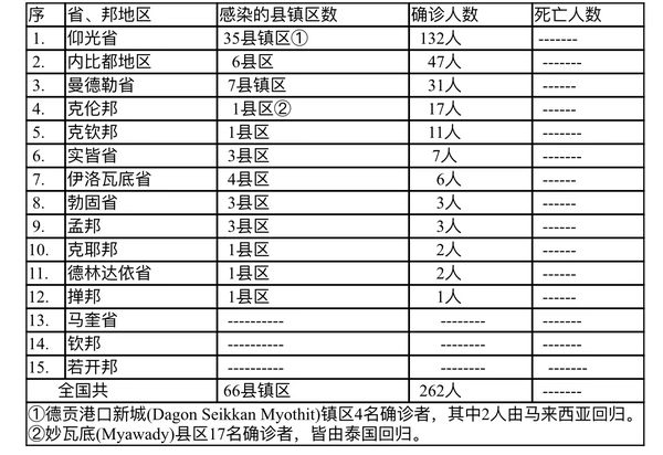 确诊者262人,来自12个省邦地区的66个县镇区。这其中由国外回归者为19人(其中由泰国回归者17人,由马来西亚回归者2人),国内确诊人员243人。这243名国内确诊人员中,仰光省占了130人(占53% 的比例),可见仰光大都市疫情虽然严重,但各省邦的疫情同样也不能令人小觑了。剩下113名国内确诊者中,内比都47人,曼德勒省有31人,克钦邦11人,实皆省7人,伊洛瓦底省6人,勃固省及孟邦各3人,克耶邦及德林达依省各2人,掸邦1人。感染人员已遍布全国各省邦地区,这疫情蔓延情况确实是已达到令人不能忽视的地步了。