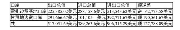 这期间由雷扎边贸基地向中国出口225,385.02美元,由甘拜地边贸基地向中国出口291,666.67美元;故克钦邦这两处边贸基地向中国共出口517,051.69美元。
