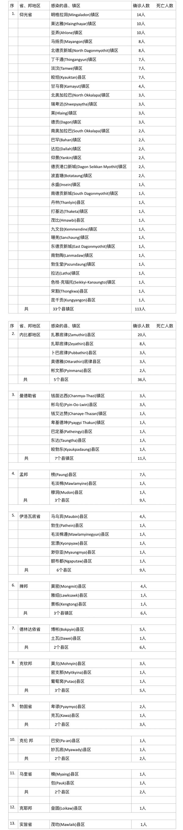 9月12日这一天缅甸全国确诊人数为204人,确诊人员来自仰光省、内比都地区、曼德勒省、孟 邦、伊洛瓦底省、掸邦、德林达依省、克钦邦、勃固省、克伦邦、马奎省、克耶邦及实皆省等13个省邦地区。各省邦地区感染的县镇区及确诊人数如下表: