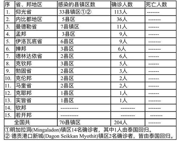 确诊者204人,来自13个省邦地区的70个县镇区。这其中由国外回归者为3人(皆由泰国回归),国内确诊人员201人。这201名国内确诊人员中,仰光省占了110人(占近 55% 的比例),可见仰光大都市疫情还是很严重,但各省邦的疫情同样也不能令人小觑了。剩下91名国内确诊者中,内比都36人,曼德勒省11人,孟邦及伊洛瓦底省各9人,掸邦及德林达依省各6人,克钦邦5人,勃固省3人,克伦邦及马奎省各2人,克耶邦及实皆省各1人。感染人员已遍布全国各省邦地区,就连内比都地区的扎慕底律县区1天的确诊人数都达到20人,这疫情蔓延情况可说已达到一定的严重地步了。