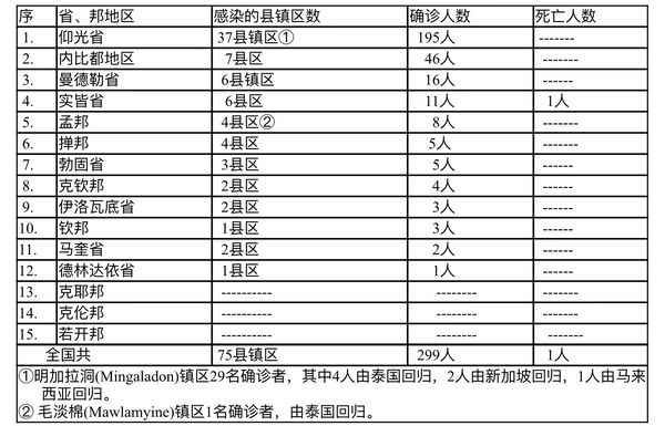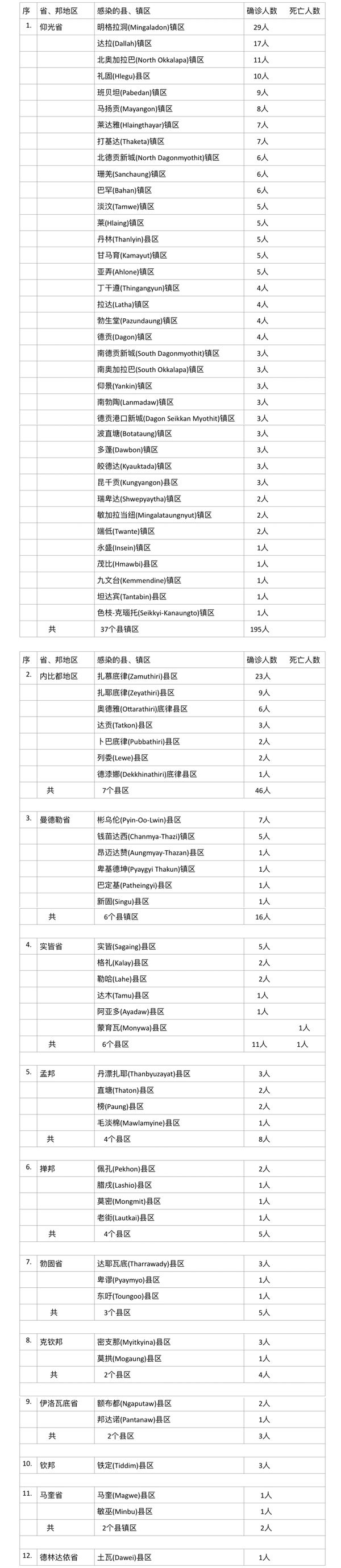 9月13日这一天缅甸全国确诊人数为299人,确诊人员来自仰光省、内比都地区、曼德勒省、实皆省、孟 邦、掸邦、勃固省、克钦邦、伊洛瓦底省、钦邦、马奎省及德林达依省等12个省邦地区。各省邦地区感染的县镇区及确诊人数如下表: