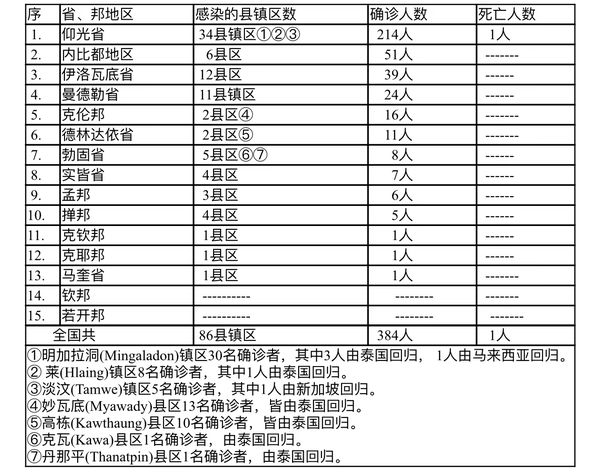 9月14日这一天缅甸全国确诊人数上升到384人,确诊人员来自仰光省、内比都地区、伊洛瓦底省、曼德勒省、克伦邦、德林达依省、勃固省、实皆省、孟邦、掸邦、克钦邦、克耶邦及马奎省等13个省邦地区。各省邦地区感染的县镇区及确诊人数如下表: