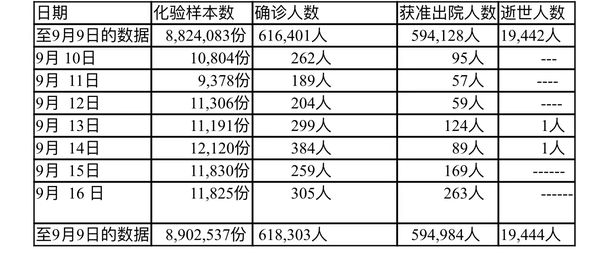 缅甸卫生部2022年9月10日至9月16日每晚8时时所公布的疫情情况分别如下: