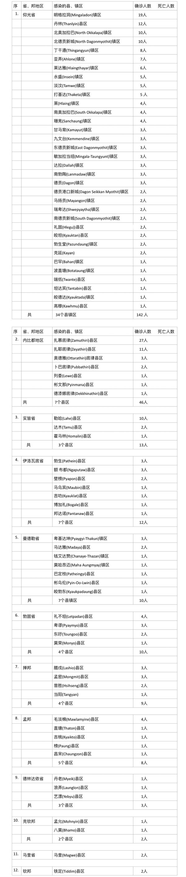 9月15日这一天缅甸全国确诊人数为259人,确诊人员来自仰光省、内比都地区、实皆省、伊洛瓦底省、曼德勒省、勃固省、掸邦、孟邦、德林达依省、克钦邦、马奎省及钦邦等12个省邦地区。各省邦地区感染的县镇区及确诊人数如下表: