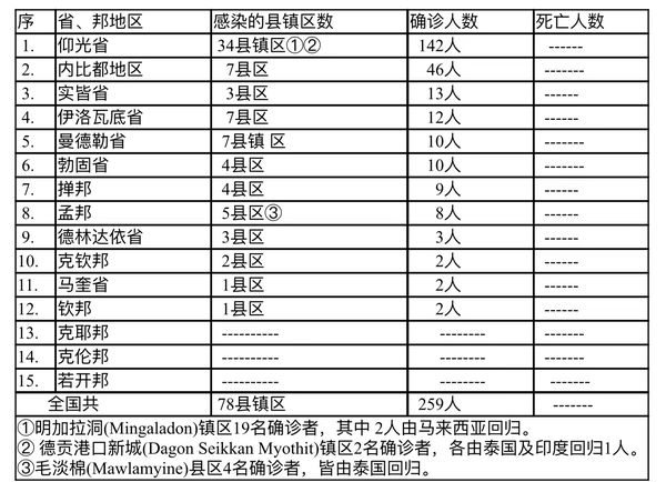 确诊者259人,来自12个省邦地区的78个县镇区。这其中由国外回归者为8人(5人由泰国回归,由马来西亚回归2人,由印度回归1人),国内确诊人员251人。这251名国内确诊人员中,仰光省占了138人(占近 55%的比例),可见仰光大都市疫情在全国范围内来说还是相当分量的,但各省邦的疫情同样也不能令人小觑了。剩下113名国内确诊者中,内比都46人,实皆省13人,伊洛瓦底省12人,曼德勒省及勃固省各有10名确诊人员,掸邦有9名确诊人员;孟邦4名国内确诊人员,德林达依省3名确诊人员,克钦邦、马奎省及钦邦各有2名确诊人员。感染人员已遍布全国各省邦地区,就连内比都地区的几个“底律”县区都出现了不少确诊人员,可见疫情蔓延情况的严重性了。