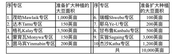 按:大豆在世界十大庄稼中名列第六,是一重要的农作物,特别是大豆油,更是一重要的植物油。世界上大豆油产量最多的国家是中国,其次是美国。缅甸虽然是一个重要的农业国家,在国内也有种植大豆,但在全球范围内,缅甸的大豆或大豆油的生产量却排不上号(在生产大豆油最多的30个国家中榜上无名,见《缅华网》2022年5月7日“缅甸新闻”栏目中的“世界大豆油生产情况”这一报导)。现在实皆省在今年冬作物种植季节时,准备再扩大种植大豆1万英亩,加上原规划种植的45,000多英亩,该省冬作物种植期间,大豆种植面积就达到5.5万多英亩,是否会改变缅甸大豆的生产情况,值得观察。
