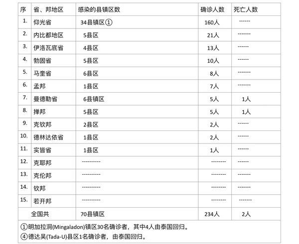 缅甸卫生部于9月19日下午4时发布公告,全国各省邦,9月18日的确诊人数234人,死亡人数2人,具体数据如下表: