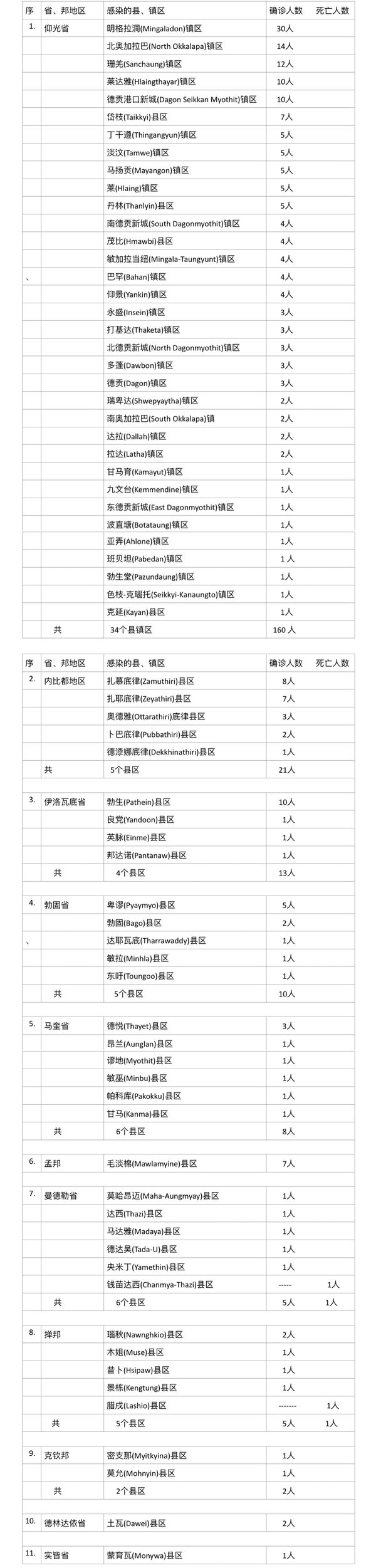 9月18日这一天缅甸全国确诊人数为234人,确诊人员来自仰光省、内比都地区、伊洛瓦底省、勃固省、马奎省、孟邦、曼德勒省、掸邦、克钦邦、德林达依省及实皆省等11个省邦地区。各省邦地区感染的县镇区及确诊人数如下表: