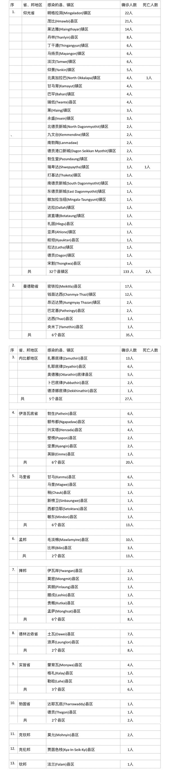 9月19日这一天缅甸全国确诊人数为269人,确诊人员来自仰光省、曼德勒省、内比都地区、伊洛瓦底省、马奎省、孟邦、掸邦、德林达依省、实皆省、勃固省、克钦邦、克伦邦及钦邦等13个省邦地区。各省邦地区感染的县镇区及确诊人数如下表: