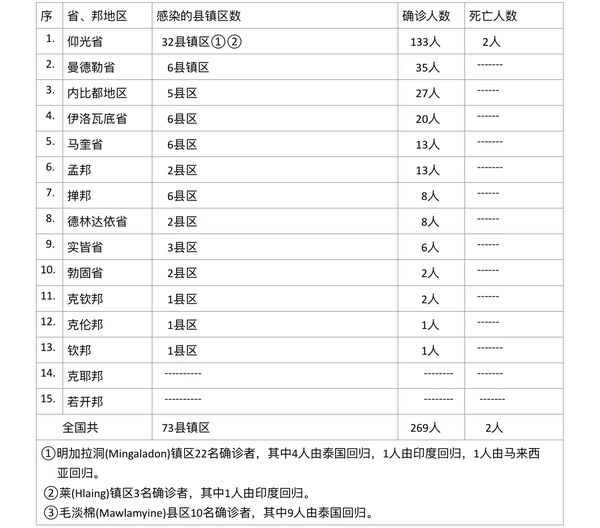 确诊者269人,来自13个省邦地区的73个县镇区。此外还有2名因疫情而死亡的人员,分别为仰光省北奥加拉巴镇区1人及瑞卑达镇区各1人。确诊者中由国外回归者为16人(由泰国回归者13人,由印度回归2人,由马来西亚回归1人),国内确诊人员253人。这253名国内确诊人员中,仰光省占了126人(几乎就是二分之一 的比例),仰光省确诊人数与各省邦地区已是平分秋色。剩下全缅各省邦127名国内确诊者中,曼德勒省35人 ,内比都27人,伊洛瓦底省20人,马奎省13人,掸邦及德林达依省各8人,实皆省6人,克伦邦国内确诊者4人,勃固省及克钦邦确诊者各2人,克伦邦与钦邦确诊者各1人。感染人员已遍布全国各省邦地区,可说全缅之内没有一个地区是能免于新冠疫情的凌虐了。