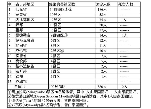 确诊者380人,来自14个省邦地区的100个县镇区。此外还有2名因疫情而死亡的人员,分别来自内比都的德漆娜县区及曼德勒省的钱艾达赞镇区。确诊者中由国外回归者为13人(由泰国回归者12人,由印度回归者1人),国内确诊人员367人。这367名国内确诊人员中,仰光省占了183人(几乎就是½ 的比例),各省邦的确诊人员与仰光省的确诊人数几乎相等。剩下全缅各省邦184名国内确诊者中,马奎省58人,内比都35人,掸邦20人,孟邦17人,曼德勒省国内确诊人员与伊洛瓦底省确诊人员均为12人,勃固省11人,实皆省7人,克钦邦5人,克伦邦国内确诊者、德林达依及若开邦的确诊者均为2人,钦邦确诊者1人。感染人员已遍布全国各省邦地区,全缅可以说没有任何一个地区是能免于新冠疫情的凌虐了。