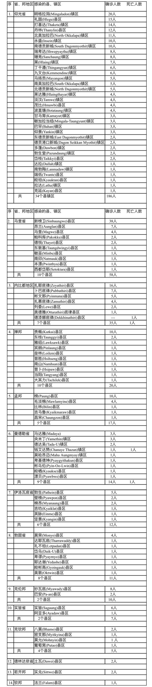 9月24日这一天缅甸全国确诊人数为380人,确诊人员来自全国14个省邦地区(仅克耶邦为零确诊地区)。各省邦地区感染的县镇区及确诊人数如下表:
