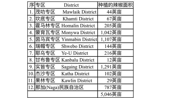 按:辣椒是缅甸民众们的餐桌上常见的一种“厨房作物”,其在全缅各地区也都广泛种植,实皆省作为一农业大省也种植了一定数量的辣椒。各专区中,实皆、茵马宾及蒙育瓦三个专区的种植面积都超过1,000英亩。而作为偏远地区的那加民族自治区的种植面积位居第四,达到787英亩,这也是一个特殊现象。有人开玩笑说可能是该地区气候特别寒冷,人们靠吃辣椒来取暖吧。