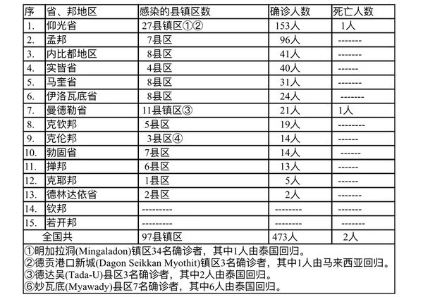确诊者473人,来自13个省邦地区的97个县镇区。另外有2名人员因新冠疫情而死亡,这是来自仰光省北德贡新城镇区1人及曼德勒省昂迈达赞镇区1人。确诊者中由国外回归者为10人(由泰国回归者9人,由马来西亚回归者1人),国内确诊人员463人。这463名国内确诊人员中,仰光省占了151人(不到三分之一的比例),各省邦的确诊人员都已是仰光省确诊人数的2倍多了。剩下全缅各省邦312名国内确诊者中,孟邦为96人,内比都地区41人,实皆省40人,马奎省31人,伊洛瓦底省24人,曼德勒省国内确诊者及克钦邦确诊者各为19人,勃固省14人,掸邦13人,克伦邦国内确诊者8人,克耶邦5人,德林达依省确诊人员2人。感染人员遍布全国各省邦地区,有的地区疫情蔓延情况已令人不可小觑。例如孟邦的毛淡棉县区单日确诊人数达到67人,是全国各县区中单日感染人数最多的一个县区。另外实皆省蒙育瓦县区确诊者35人,仰光省方面作为农业县的礼固县区确诊人数41人,也是令人不可忽视的了。