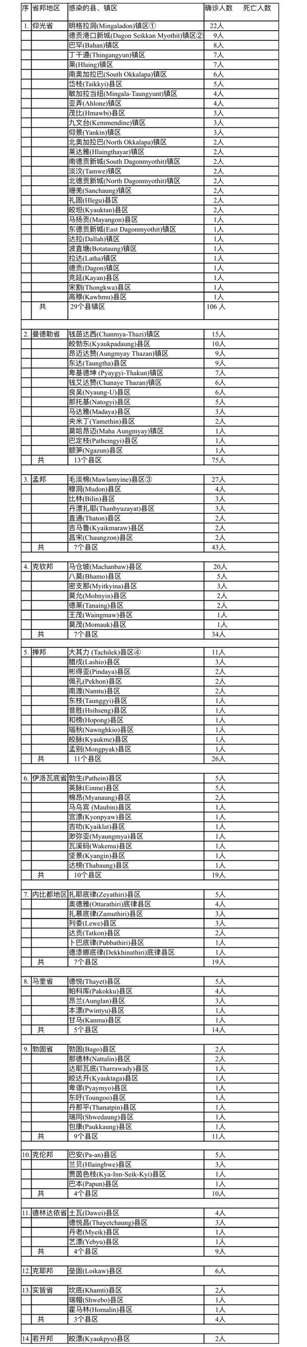 10月3日这天确诊人员来自全国14个省邦地区,仅钦邦为零确诊地区了。