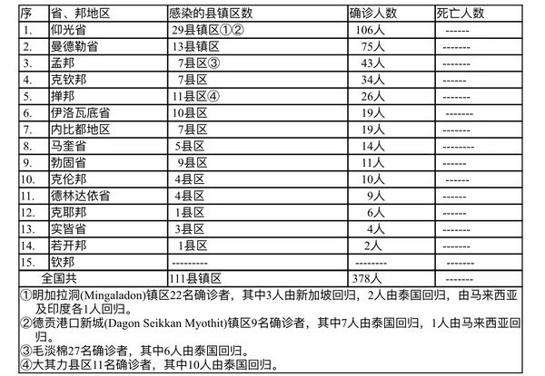 确诊者378人,来自14个省邦地区的111个县镇区。确诊者中由国外回归者为31人(由泰国回归者25人,由新加坡回归者3人,由马来西亚回归者2人,由印度回归者1人),国内确诊人员347人。这347名国内确诊人员中,仰光省占了91人(只有26%的比例),各省邦的确诊人员都已是仰光省确诊人数的2倍半多了。剩下全缅各省邦256名国内确诊者中,曼德勒省75人,孟邦国内确诊者37人,克钦邦34人,伊洛瓦底省及内比都各为19人,掸邦国内确诊者16人,马奎省14人,勃固省11人,克伦邦10人,德林达依省9人,克耶邦6人,实皆省4人,若开邦2人。感染人员遍布全国各省邦地区。而且有的县区确诊人数增多,不可小觑。例如孟邦首府毛淡棉,确诊人数27人,扣除国外回归确诊人员6人,本地确诊人数21人。而克钦邦的马仓坡县区,这一极北的边陲地区,单日确诊者居然也达到20人,这也是不可忽视的一个现象。缅甸国内疫情真可以说是方兴未艾呢。