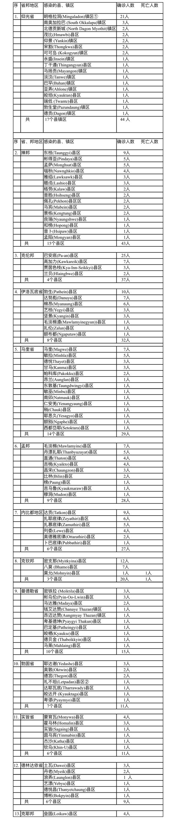 10月13日这一天缅甸全国确诊人数为310人,确诊人员来自全国13个省邦地区(仅钦邦及若开邦是零确诊地区)。各省邦地区感染的县镇区及确诊人数如下表: