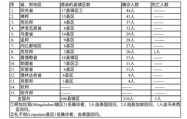 确诊者310人,来自13个省邦地区的106个县镇区,另外还有1名民众因新冠疫情而死亡,这是来自克钦邦莫允县区的1名民众。确诊者中由国外回归者为7人(4人由泰国回归,2人由新加坡回归,1人由马来西亚回归)。国内确诊者303人,仰光省只占38人(约为八分之一的比例)。各省邦的确诊人员是仰光省确诊人数的近7倍多了。这当中比较严重的县区有克伦邦首府巴安县区(确诊人数25人,是单日确诊人数最多的一个县区)。各省邦国内确诊人员265人中,掸邦43人,克伦邦37人,伊洛瓦底省32人,马奎省29人,孟邦28人,内比都27人,克钦邦20人,曼德勒省15人,实皆省11人,勃固省国内确诊者10人,德林达依省9人,克耶邦4人。全国各省邦确诊人数此起彼伏,确诊人员有继续增多的趋势,民众们对此要有足够的认识,一些医务人员这样提醒道。