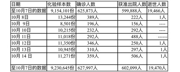 缅甸卫生部2022年10月8日至10月14日每晚8时时所公布的疫情情况分别如下: