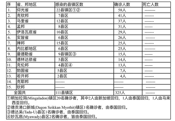 确诊者325人,来自13个省邦地区的111个县镇区。确诊者中由国外回归者为8人(5人由泰国回归,由新加坡回归者2人,由马来西亚回归者1人)。国内确诊者317人,仰光省占53人(约为六分之一的比例)。各省邦的确诊人员是仰光省确诊人数的近5倍。各省邦国内确诊人员264人中, 克钦邦41人,马奎省37人,孟邦31人,伊洛瓦底省29人,实皆省26人,掸邦与内比都各25人,曼德勒省国内确诊者与德林达依省各14人,克伦邦国内确诊者11人,勃固省7人,若开邦4人。全国各省邦确诊人数此起彼伏,变化不定。其中克钦邦莫允县区单日确诊者27人,成为该日全国各县区中确诊人数最多的一个县,这些都是应多加注意的现象,要谨防这些地区疫情出现“死灰复燃”的现象呢。