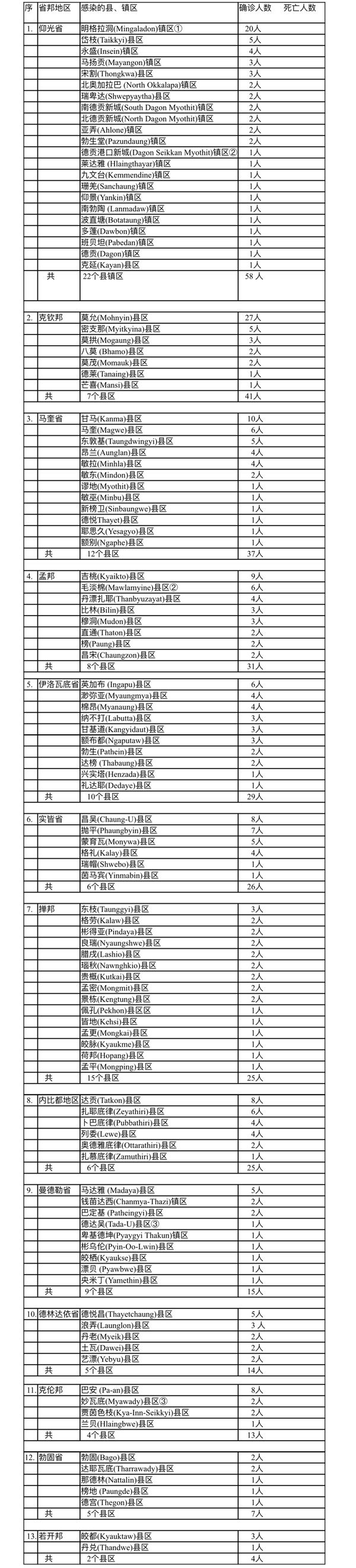 10月15日这一天缅甸全国确诊人数为325人,确诊人员来自全国13个省邦地区(仅钦邦及克耶邦是零确诊地区)。各省邦地区感染的县镇区及确诊人数如下表: