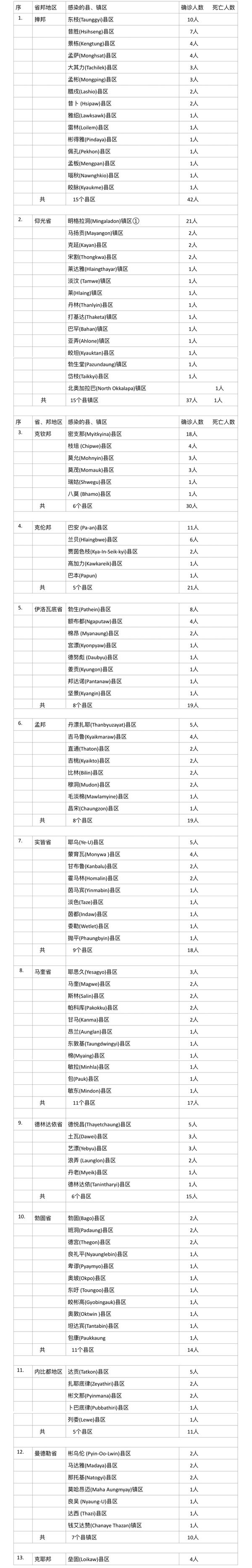 10月21日这一天缅甸全国确诊人数为257人,确诊人员来自全国13个省邦地区(仅钦邦及若开邦为零确诊地区)。各省邦地区感染的县镇区及确诊人数如下表: