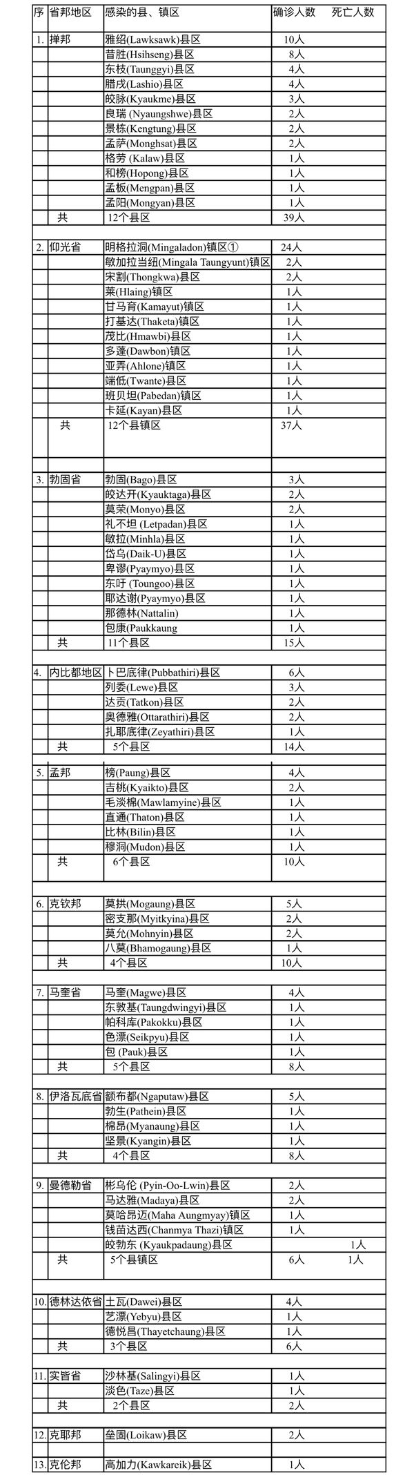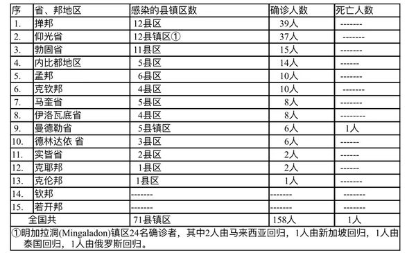 10月23日这一天缅甸全国确诊人数为158人,确诊人员来自全国13个省邦地区(仅钦邦及若开邦为零确诊地区)。各省邦地区感染的县镇区及确诊人数如下表: