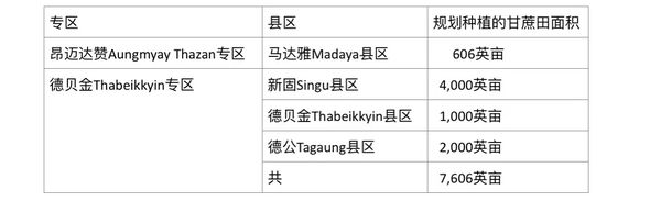 这些新甘蔗田将在2个专区内的4个县区内进行种植。两个专区是昂迈达赞专区及德贝金(Thabeikkyin)专区,这2个专区内规划种植的新甘蔗田如下表: