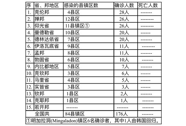 确诊者176人,来自14个省邦地区的84个县镇区。确诊者中有1名国外回归者(由韩国回归)。国内确诊者175人中仰光省只占25人(占七分之一的比例),各省邦的国内确诊人员约为仰光省的6倍。各省邦国内 确诊人员150人中,克伦邦28人,掸邦26人,曼德勒省及德林达依省各20人,伊洛瓦底省及孟邦各11人,勃固省10人,内比都7人,克钦邦6人,马奎省5人,实皆省3人,钦邦2人,克耶邦1人。