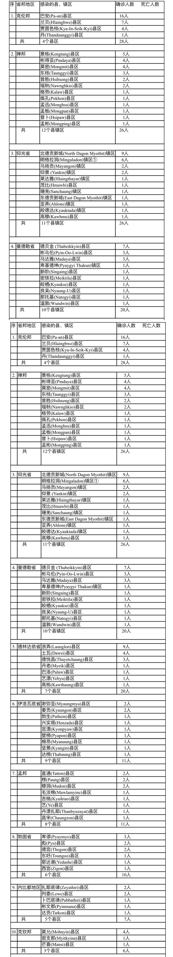 10月27日这一天缅甸全国确诊人数为176人,确诊人员来自全国14个省邦地区(仅若开邦为零确诊地区)。各省邦地区感染的县镇区及确诊人数如下表: