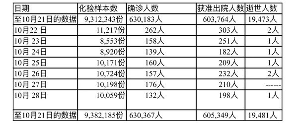 缅甸卫生部2022年10月22日至10月28日每晚8时所公布的疫情情况分别如下:
