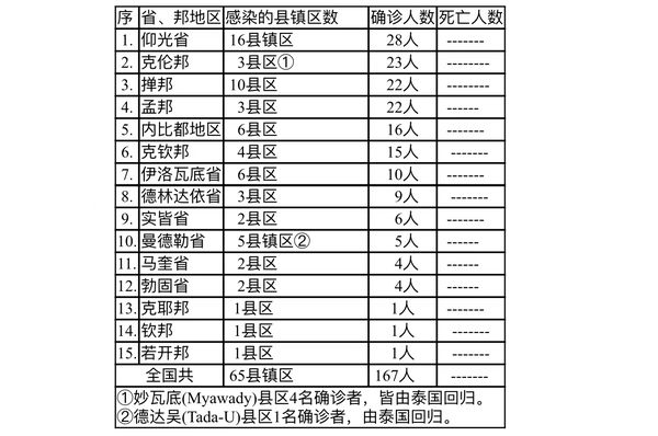 确诊者167人,来自15个省邦地区的65个县镇区。确诊者中有5名国外回归者(皆由泰国回归)。国内确诊者162人中仰光省只占28人(约为17%的比例),各省邦的国内确诊人员将近仰光省的5倍。各省邦国内 确诊人员134人中,掸邦与孟邦各为22人,克伦邦国内确诊者19人(另有4人为国外回归者),内比都16人,克钦邦15人,伊洛瓦底省10人,德林达依省9人,实皆省6人,曼德勒省国内确诊者、马奎省省及勃固各4人,钦邦、克耶邦及若开邦各1人。