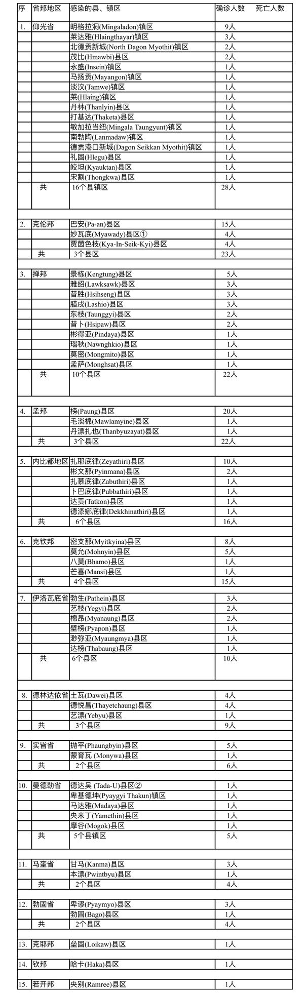 10月29日这一天缅甸全国确诊人数为167人,确诊人员来自全国15个省邦地区(没有任何省邦地区为零确诊地区)。各省邦地区感染的县镇区及确诊人数如下表: