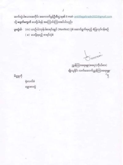 【缅甸中文网讯】企划与财政部消息,10月27日,缅甸税务管理司(调查与打击走私分部),向缅甸长途物流运输商人协会主席、缅甸集装箱货车运输协会主席及缅甸国际物流运输商人协会主席,发布了通知。