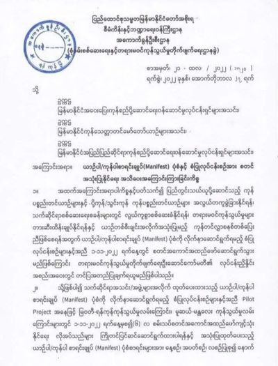 从声明中得知,经打击走私贸易委员会工作协商会议决定,将从11月1日(今天)开始,在木姐-曼德勒及妙瓦底-仰光贸易通道,试行舱单(Manifest)申报系统。据悉,申报系统试行期限为6个月。
