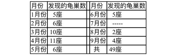 该龟岛上海龟源源不绝前来筑巢产卵,今年1月至9月间共发现49处龟巢。各月份发现的海龟龟巢数目如下表: