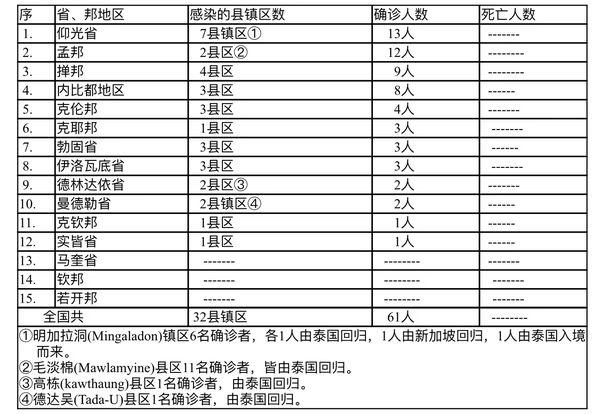 确诊者61人,来自12个省邦地区的32个县镇区。确诊者中有16名国外回归者(14人由泰国回归,1 人由新加坡回归,1人自泰国入境而来)。国内确诊者45人中仰光省占10人(占22%比例),各省邦的国内确诊人员约为仰光省的3.5倍。各省邦国内 确诊人员35人中,掸邦9人,内比都地区8人,克伦邦4人,克耶邦、勃固省及伊洛瓦底省各3人,德林达依国内确诊者、曼德勒省国内确诊者及孟邦国内确诊者各1人,实皆省及克钦邦各1人。孟邦有11名确诊者自泰国回归,德林达依省及曼德勒省也各有1名确诊者自泰国回归。