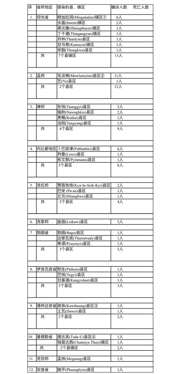 11月10日这一天缅甸全国确诊人数为61人,确诊人员来自全国12个省邦地区(马奎省、钦邦及若开邦这3个省邦地区为零确诊地区)。各省邦地区感染的县镇区及确诊人数如下表: