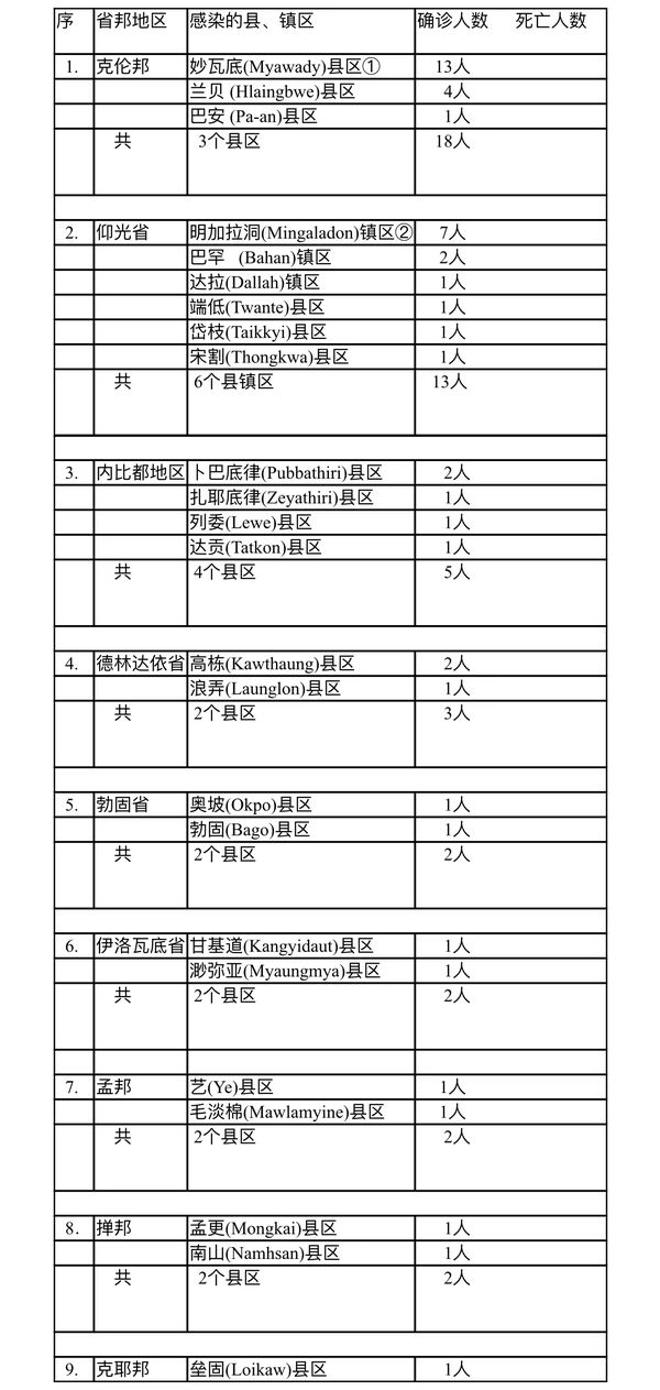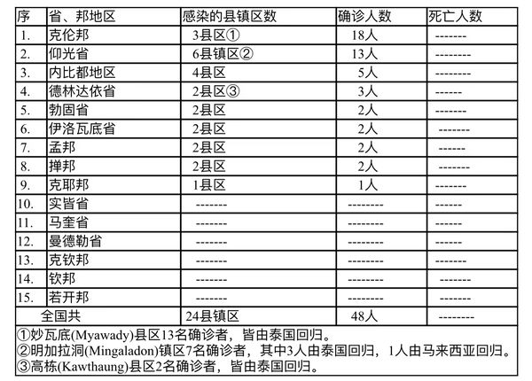 确诊者48人,来自9个省邦地区的24个县镇区,确诊者中有19名国外回归者(18人由泰国回归,1人由马来西亚回归)。国内确诊者29人中仰光省只占9人(约占三分之一的比例),各省邦的国内确诊人员约为仰光省的2倍多。各省邦国内 确诊人员20人中,克伦邦国内确诊者及内比都地区各为5人(克伦邦另有13名确诊者由泰国回归),勃固省、伊洛瓦底省、孟邦及掸邦各2人,德林达依省国内确诊者及克耶邦各1人。克伦邦有13名确诊者自泰国回归,仰光省有4名确诊者自国外回归(3人由泰国回归,1人由马来西亚回归),德林达依省也有2名确诊者自泰国回归。