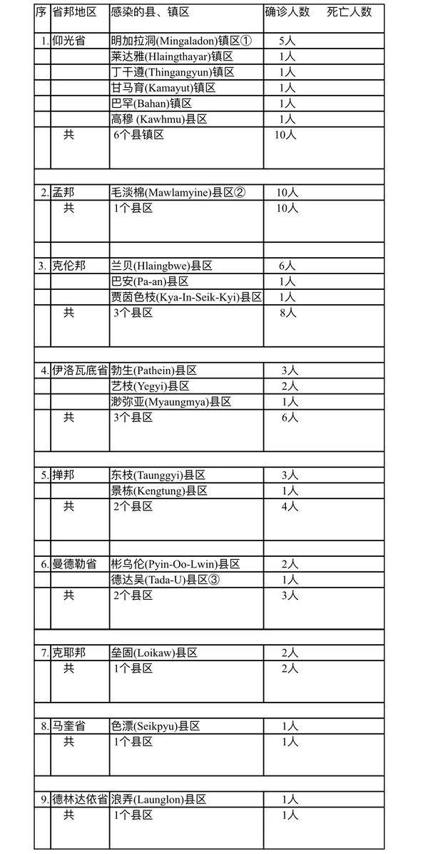 11月17日这一天缅甸全国确诊人数为45人,确诊人员来自全国9个省邦地区(实皆省、勃固省、内比都地区、克钦邦、钦邦及若开邦这6个省邦地区为零确诊地区)。各省邦地区感染的县镇区及确诊人数如下表: